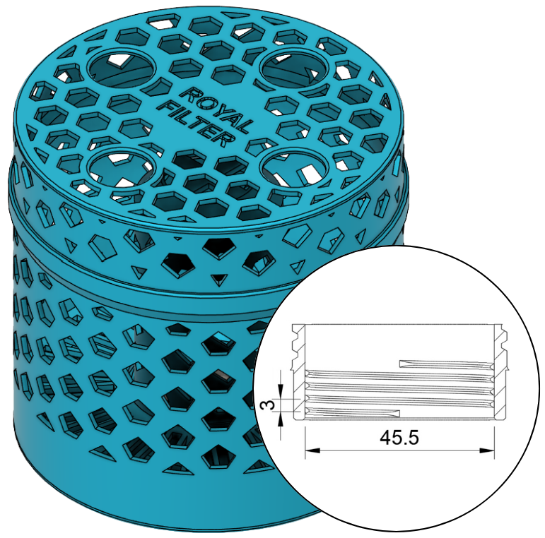 Er hat eine zylindrische Form, sein unterer Teil ist mit einem austauschbaren Gewindeadapter oder nur mit einem Loch versehen, je nach Art der Filterarmatur im jeweiligen Whirlpool. Das untere Drittel der Länge des ROYAL FILTERs ist rundherum massiv, die oberen zwei Drittel sind perforiert und der obere Deckel des ROYAL FILTERs ist ebenfalls perforiert. Von der unteren Einlassöffnung bis zu zwei Dritteln der Länge des ROYAL FILTERs gibt es einen zentralen perforierten Einlassstutzen, der an seiner Mündung eine massive Wand hat, die den Raum für den Skimmer des ROYAL FILTERs definiert. Auf dieser Ebene befindet sich um den gesamten Umfang herum ein Abschöpfgitter, das den Abschöpfbereich von den ROYAL-Multifunktions-Mikrofiltrationsmedien trennt.